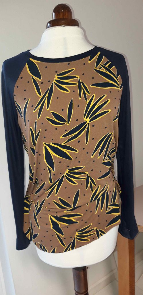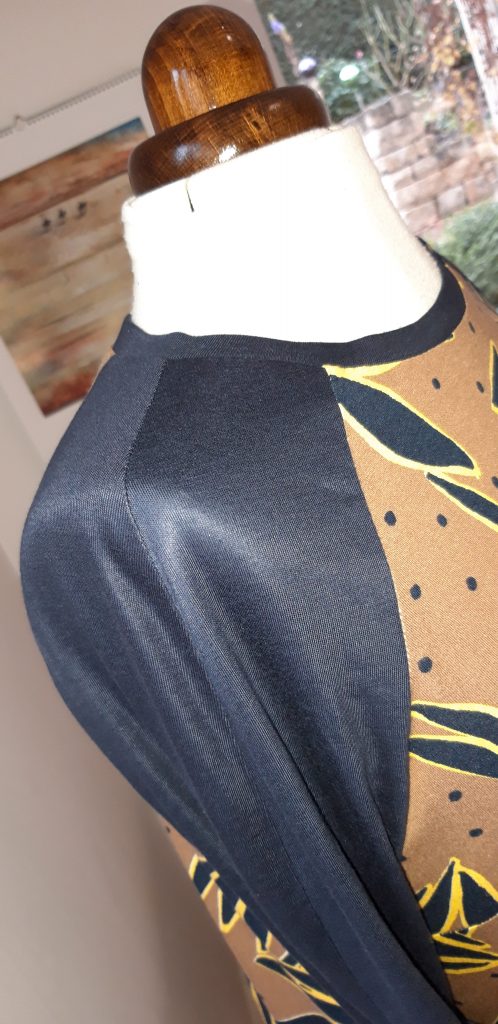 Werke aus den Nähkursen ★ „Stil-Blüten“ 8. Oktober 2023 / Schlichter Schnitt mit vielen Möglichkeiten. Der Raglanärmel besteht aus 2 Teilen und wird mit einer so genannten Oberarmnaht vom Hals über die Schulter bis zum Handgelenk in einem Arbeitsgang geschlossen.
