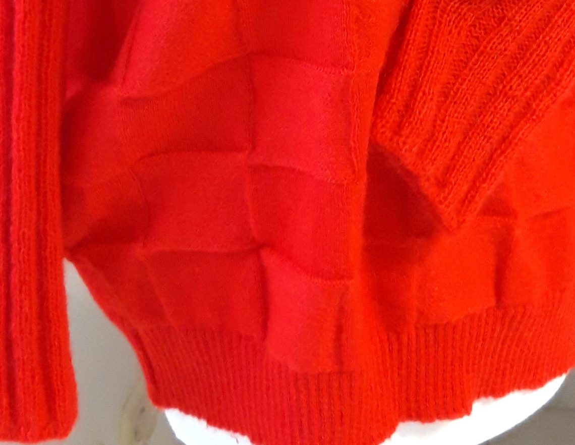 Nicht nur zur Weihnachtszeit… Ein Strickpanel (ein gerades Stück Strickware auf der Strickmaschine gefertigt) für Rücken- und Vorderteil mit bereits angestricktem Bündchen. Die Armstulpen wurden separat handgestrickt. Dann erfolgte die Verarbeitung der Nähte an der Nähmaschine, die offenen Kanten wurden mit sehr dünnem Schrägband eingefasst ★ fertig ist der rote Pullover. Das Material – ein Kaschmir- / Seidengemisch – macht ihn zum ganzjährigen Begleiter, der auch an kühlen Abenden im Frühling oder im Sommer angenehm auf der Haut zu tragen ist.
