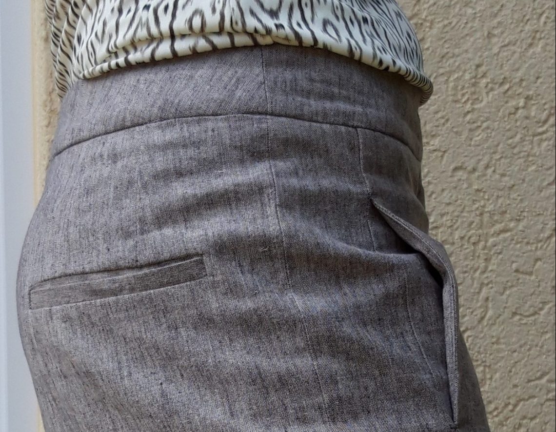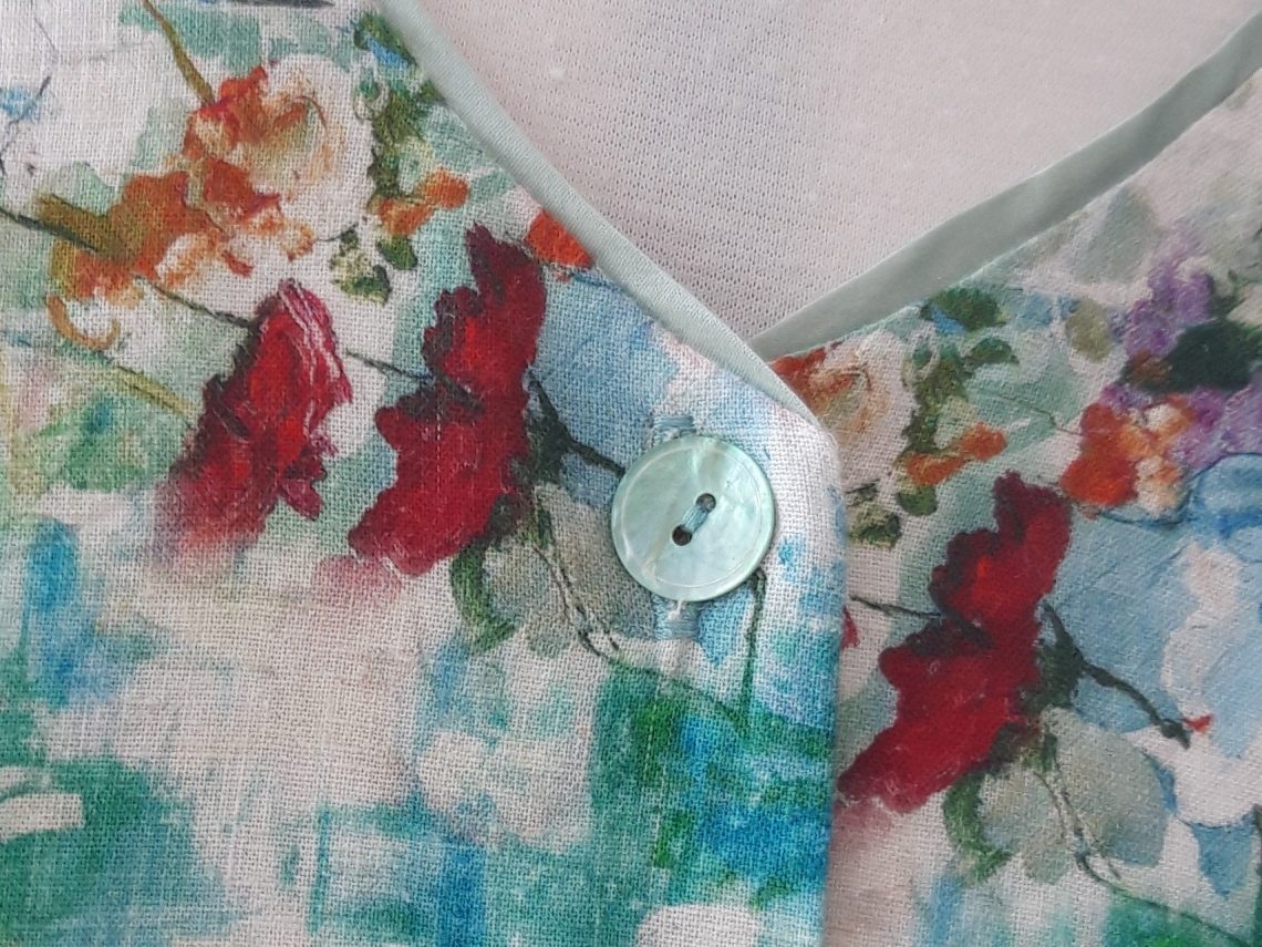 Bluse aus Viskoseleinen, paspeliert mit Seidensatin.