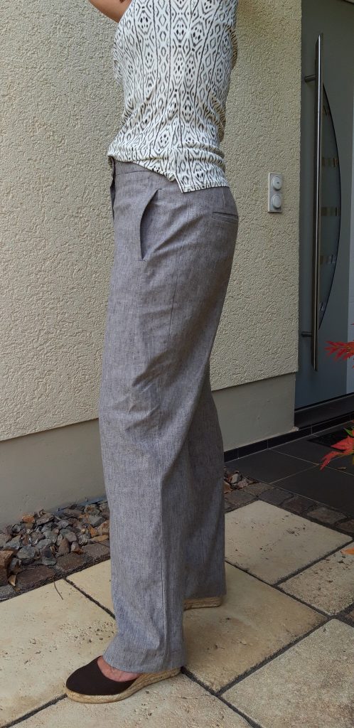 Eine schöne Sommerhose, bei der die vordere Tasche in einen bis zum Knie reichenden Abnäher gearbeitet wurde. Das Material ist ein Leinenmix.