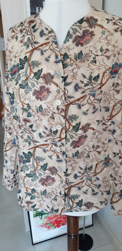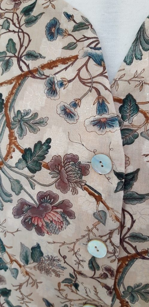 Das Material ist ein hauchdünner Baumwoll-Batist mit eingewebtem floralem Muster in Ausbrenneroptik, das mit einem farbigen Druck von Blumenranken überdeckt wird.