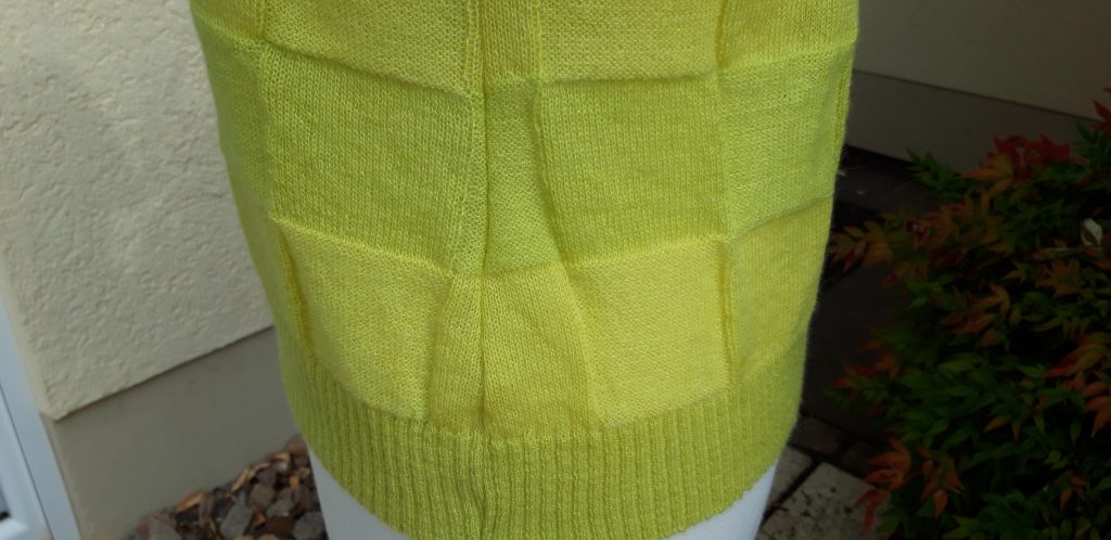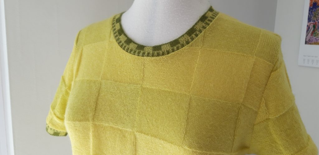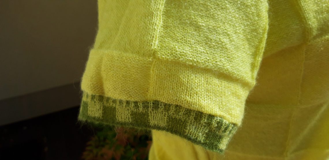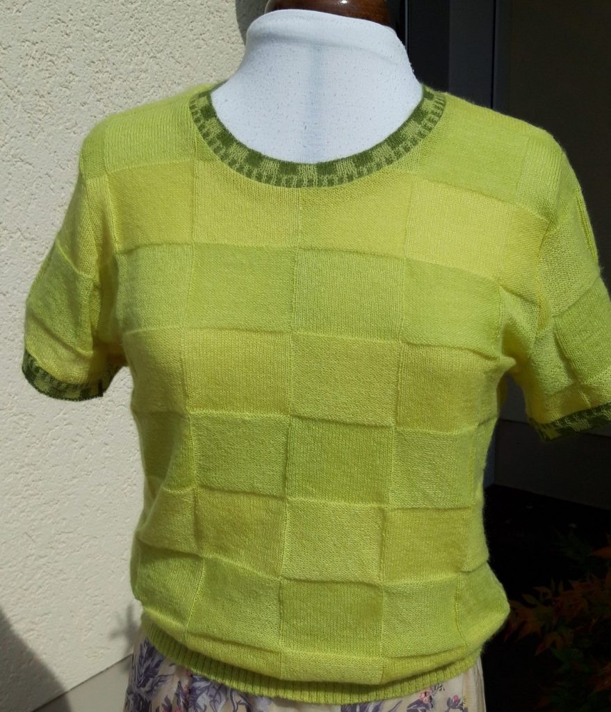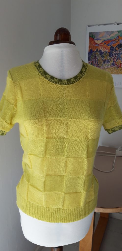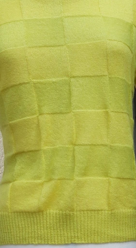 In wunderschönen gelbgrünen Nuancen erscheint dieser Pulli aus feinstem Mohair im Schachbrettmuster. Die Basis war ein großes Strickpanel mit breitem Rippenstrickbund, ausreichend für Vorder- und Rückenteil sowie für die kurzen Ärmel.