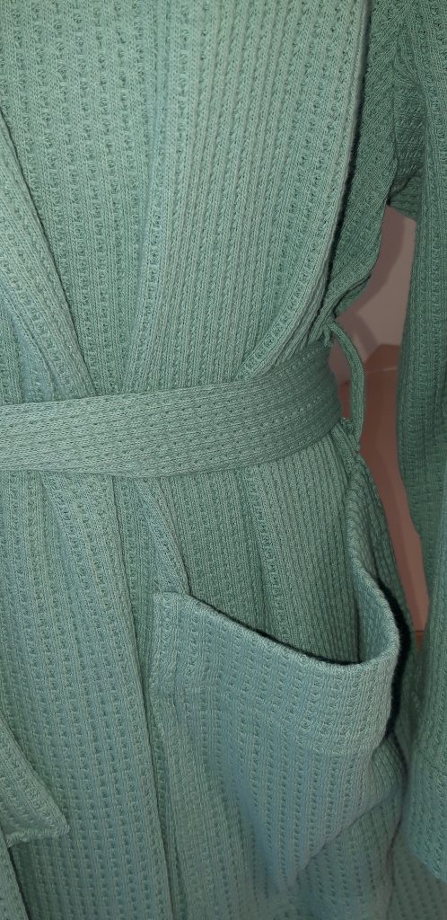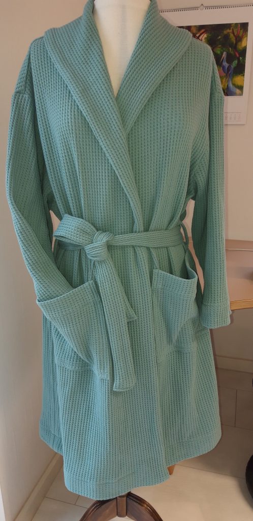 Design, Nähkurse, Neues aus der Werkstatt, Stoffe, Topaktuell, Werke aus den Nähkursen ★ Wellness 4. Mai 2025 / Bademantel aus schwerem Waffeljersey. Das Material ist weich und anschmiegsam. Der großzügige Schalkragen wirkt elegant. Übergroße Taschen sind ein modisches, wie praktisches Detail. Text …